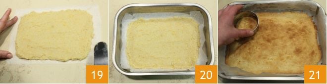 und streichen Sie ihn zu einem Rechteck von etwa 18 x 25 cm 19. Legen Sie den Keksboden auf ein etwas größeres rechteckiges Backblech 20 und backen Sie ihn im vorgeheizten statischen Ofen bei 180° für 15 Minuten (oder im Umluftofen bei 160° für etwa 10 Minuten). Wenn die Oberfläche des Kekses goldbraun ist, nehmen Sie ihn aus dem Ofen und lassen Sie ihn abkühlen. Einmal kalt, schneiden Sie die Kekse mit einem runden Ausstecher mit einem Durchmesser von 8 cm 21.