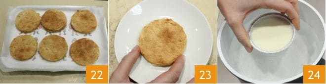 Sie erhalten 6 Keksscheiben 22. Jetzt können Sie Ihr Dessert zusammenstellen: Legen Sie einen Keks auf einen Dessertteller 23, entformen Sie die süße Milch, um Ihnen diese Operation zu erleichtern, tauchen Sie sie kurz in eine Schüssel mit warmem Wasser 24,