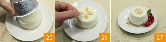 und legen Sie sie dann auf den Keks 25. Ihre köstliche süße Milch ist fertig, bevor Sie sie servieren, garnieren Sie sie nach Belieben mit Mandelblättchen 26 und Johannisbeeren 27.