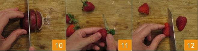 Weiter mit der Pflaume, indem Sie sie in Scheiben schneiden 10. Entfernen Sie die Blätter der Erdbeeren 11 und teilen Sie sie in zwei Hälften 12.