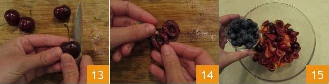 Zum Schluss teilen Sie die Kirschen in zwei Hälften 13 und entsteinen Sie sie 14. Jetzt ist alles bereit, um die süße Panzanella zusammenzustellen: In einer großen Schüssel geben Sie das gesamte geschnittene Obst und fügen Sie auch die ganzen Blaubeeren hinzu 15,