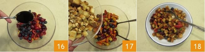 benetzen Sie alles mit Feigenmost 16. Fügen Sie auch das geröstete Brot mit den Haselnüssen hinzu 17, würzen Sie mit Minzblättchen und würzen Sie mit einer Prise Fleur de Sel. Alles mit einem Löffel vermischen und Ihre süße Panzanella servieren 18, nach Belieben begleitet von Sauerrahm, Eis oder Joghurt.