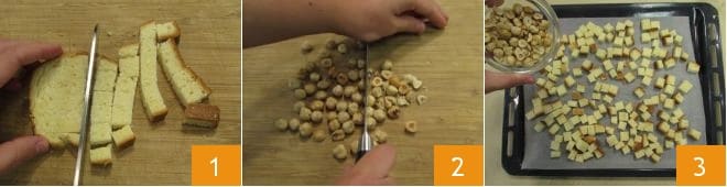 Um die süße Panzanella zuzubereiten, schneiden Sie zuerst das Briochebrot in etwa 1,5 cm große Würfel 1 und hacken Sie die Haselnüsse grob 2. Legen Sie ein Backblech mit Backpapier aus und verteilen Sie darauf die Briochewürfel und die gehackten Haselnüsse 3.