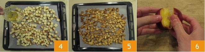 Beträufeln Sie alles mit einem Esslöffel Honig 4 und rösten Sie es im vorgeheizten Ofen bei 200° für 10 Minuten. Wenn das Brot schön golden und geröstet ist, nehmen Sie das Blech heraus 5 und lassen es abkühlen. In der Zwischenzeit waschen und trocknen Sie das Obst, teilen Sie den Pfirsich in zwei Hälften 6