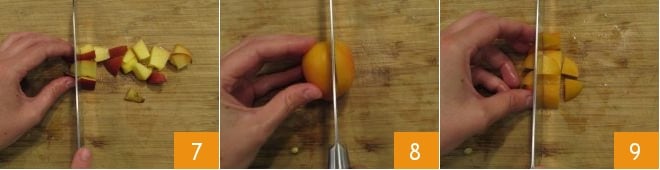 entfernen Sie den Kern und schneiden Sie ihn in kleine Würfel 7. Verfahren Sie auf die gleiche Weise mit den Aprikosen (8-9)
