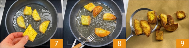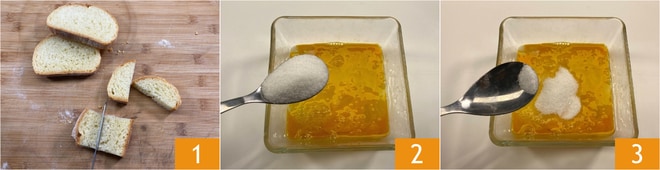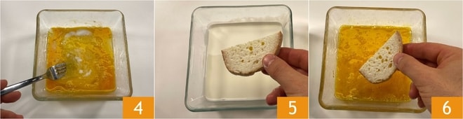 Gut mit einer Gabel schlagen 4. Tauchen Sie jedes Stück Brot schnell zuerst in die Milch 5 und dann in die Eiermischung 6, wobei überschüssige Flüssigkeit abtropft.