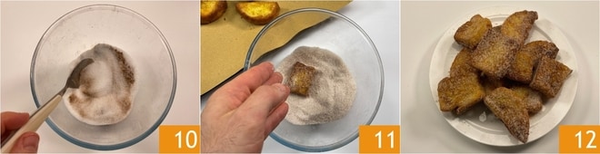 In einer anderen Schüssel den Zucker mit dem Zimt mischen 10. Bestreuen Sie die Würfel mit dem aromatisierten Zucker 11 und servieren Sie Ihr süßes gebratenes Brot sofort 12!