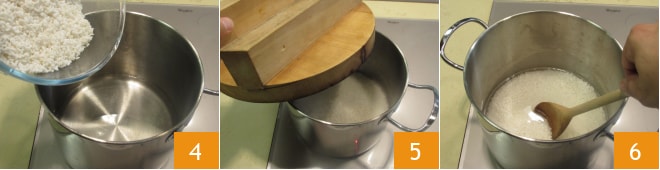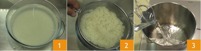 Um den Sushireis zuzubereiten, waschen Sie zuerst den Reis, um Verunreinigungen zu entfernen. Geben Sie ihn dann in eine Schüssel mit kaltem Wasser und erneuern Sie das Wasser, bis es klar wird. Dann lassen Sie den Reis eine Stunde lang einweichen 1. Gießen Sie ihn ab 2 und lassen Sie ihn 5 Minuten in einem Sieb ruhen, das auf eine weitere Schüssel gestellt wird. In einem hohen Topf 500 g Wasser einfüllen 3