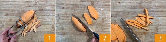 Um die Süßkartoffeln in der Heißluftfritteuse zuzubereiten, beginnen Sie damit, die Schale mit einem Sparschäler zu entfernen 1. Dann schneiden Sie sie in 1 cm dicke Scheiben 2 und schließlich in Stifte 3.