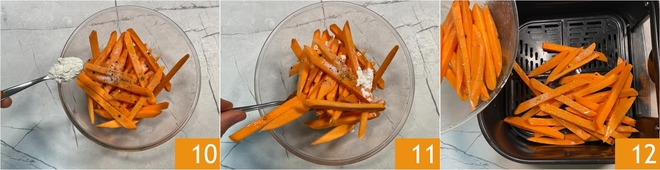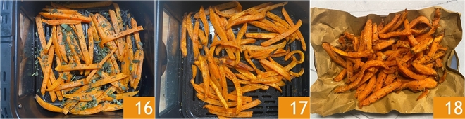 Fügen Sie auch die Maisstärke hinzu 10 und mischen Sie alles gut 11. Geben Sie die gewürzten Süßkartoffeln in den Korb der Heißluftfritteuse 12