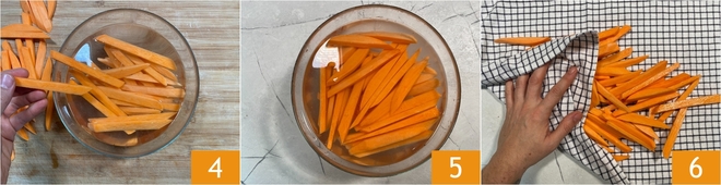 Um den Kartoffeln etwas Stärke zu entziehen, tauchen Sie sie in kaltes Wasser 4 und lassen Sie sie 10 Minuten lang darin 5. Nach 10 Minuten abtropfen lassen und auf ein sauberes Geschirrtuch legen, um sie gut abzutrocknen 6.
