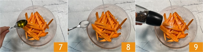 Sobald sie trocken sind, geben Sie die Süßkartoffeln in eine Schüssel. Würzen Sie sie mit nativem Olivenöl extra 7, feinem Salz 8 und einer Prise schwarzem Pfeffer 9.