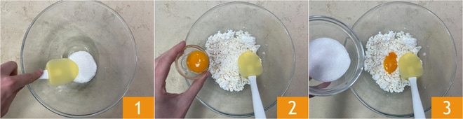 Um die Syrniki zuzubereiten, geben Sie den Käse in eine Schüssel und zerdrücken ihn mit einem Spatel 1, dann fügen Sie das Eigelb 2 und den Zucker 3 hinzu.