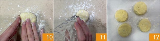 Legen Sie die Kugel auf die Arbeitsfläche, bestäuben Sie auch die Oberfläche leicht mit Mehl und drücken Sie sie vorsichtig flach 10, dann helfen Sie sich mit einem Glas, um eine runde Form zu erhalten 11. Legen Sie die Syrniki auf ein mit Mehl bestäubtes Tablett 12 und stellen Sie sie für eine Stunde in den Gefrierschrank.