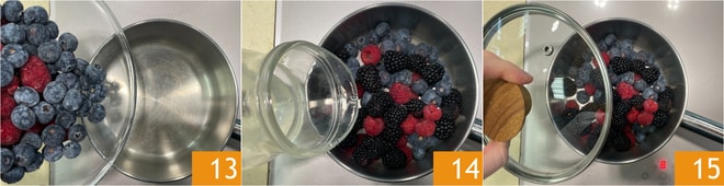 In der Zwischenzeit bereiten Sie die Waldbeersauce zu: Geben Sie die Heidelbeeren, Himbeeren und Brombeeren in einen kleinen Topf 13, fügen Sie dann etwas Wasser hinzu 14 und decken Sie den Topf mit einem Deckel ab 15.