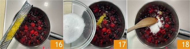 Stellen Sie die Hitze auf mittlere bis niedrige Stufe, fügen Sie dann die geriebene Zitronenschale 16 und den Zucker 17 hinzu. Kochen Sie etwa 15 Minuten, gelegentlich umrühren 18.