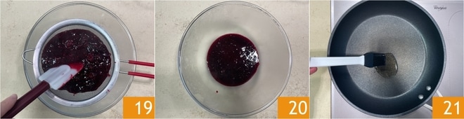 Nach dieser Zeit die Waldbeersauce abseihen 19 und abkühlen lassen 20. Sie können mit dem Kochen fortfahren: eine Antihaft-Pfanne mit Pflanzenöl einfetten 21 und sie gut erhitzen.