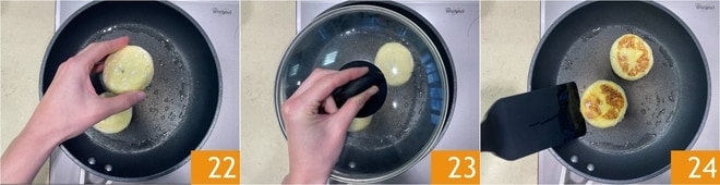 Legen Sie die Syrniki hinein 22, decken Sie sie mit einem Deckel ab 23 und braten Sie sie etwa 3 Minuten lang, indem Sie sie von beiden Seiten wenden 24.