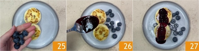 Servieren Sie die Syrniki mit frischen Heidelbeeren 25 und der Waldbeersauce 26, nach Belieben mit Puderzucker bestäubt 27!