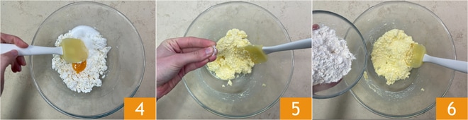 Mischen Sie, um alles zu verbinden 4. Wenn die Mischung gelb geworden ist, fügen Sie eine Prise Salz 5 und nach und nach das Mehl 6 hinzu, wobei Sie es gleichmäßig einarbeiten.