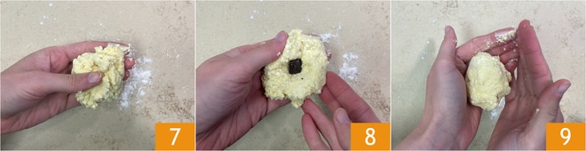 Bestäuben Sie die Arbeitsfläche mit etwas Mehl, nehmen Sie dann ein Viertel der Mischung und drücken Sie es leicht in der Handfläche 7. Legen Sie ein Stück Zartbitterschokolade in die Mitte 8 und formen Sie die Mischung zu einer Kugel 9.