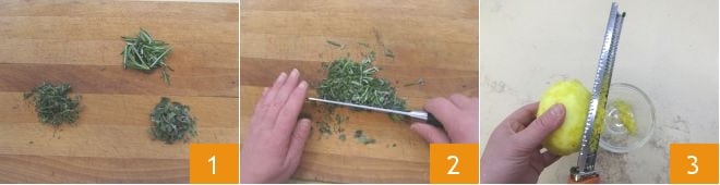 Um den Truthahn mit Kräutern und exotischem Salat zuzubereiten, beginnen Sie mit der Marinade der Truthahnbrust. Legen Sie Thymian, Majoran und Rosmarin auf ein Schneidebrett 1 und hacken Sie sie fein 2. Reiben Sie dann die Schale einer halben Zitrone ab 3