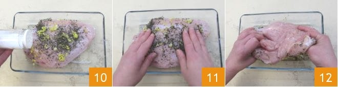 Bestreuen Sie mit Salz und Pfeffer 10 und massieren Sie gut, um die Aromen aufzunehmen 11. Drehen Sie dann die Truthahnbrust auf die andere Seite 12 und wiederholen Sie den Vorgang mit den restlichen Zutaten.