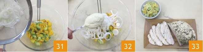 Fügen Sie auch die abgetropfte und gespülte Zwiebel hinzu 31, und würzen Sie schließlich mit der zuvor zubereiteten Sauce 32, wobei Sie etwas davon zurückhalten, um die Truthahnscheiben zu garnieren. Servieren Sie Ihren Krauttruthahn in Scheiben, mit etwas Sauce garniert, und begleiten Sie ihn mit dem exotischen Salat 33.