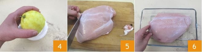 und pressen Sie den Saft aus 4. Nun, da die Zutaten bereit sind, beginnen Sie mit der Reinigung des Fleisches: Entfernen Sie das Fett und den Knorpel 5, nehmen Sie dann eine ausreichend große Auflaufform und legen Sie die gereinigte Truthahnbrust hinein 6.