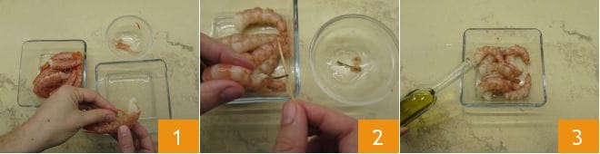 Um die Tacos mit Grünkohl und Garnelen zuzubereiten, beginnt mit letzterem. Entfernt den Panzer von den Garnelenschwänzen 1 und entfernt mit einem Zahnstocher vorsichtig den schwarzen Faden 2, ohne ihn zu zerbrechen. Legt sie nach und nach in eine Schüssel, würzt sie mit Salz, 20 g Öl 3