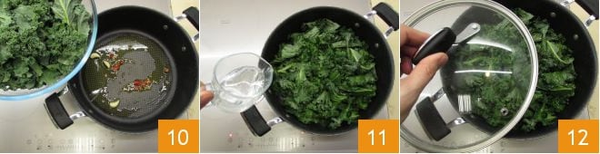 Gebt den Grünkohl hinein 10, lasst ihn 1 Minute würzen, dann gebt das heiße Wasser hinzu 11 und rührt erneut um. Salzt, deckt den Topf ab 12 und lasst alles etwa 8 Minuten kochen.