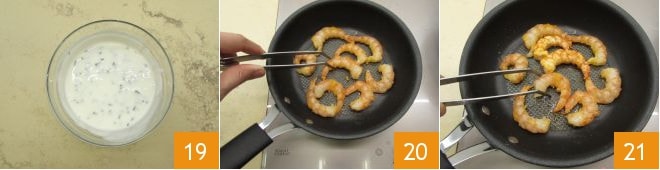 Stellt die Soße beiseite 19 und kümmert euch um das Garen der Garnelen. Erhitzt bei hoher Flamme eine Pfanne und gebt die Garnelen hinzu 20. Wartet etwa 1 Minute, dann wendet sie auf die andere Seite 21 und beendet das Garen für eine weitere Minute.