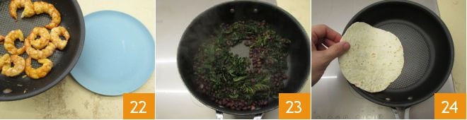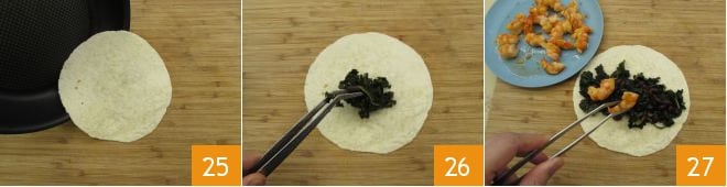 Übertragt die Garnelen auf einen Teller 22. Zu diesem Zeitpunkt wird auch der Grünkohl fertig sein 23. Erhitzt die erste Tortilla in einer Pfanne 24.