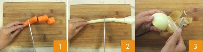 Um die Lamm-Tajine mit Pflaumen und Mandeln und aromatischem Couscous zuzubereiten, beginnen Sie mit der Gemüsebrühe: Füllen Sie einen großen Topf mit Wasser, salzen Sie und bringen Sie es zum Kochen. Schälen Sie dann die Karotten mit einem Sparschäler und schneiden Sie sie in Stücke 1. Fahren Sie damit fort, den Selleriestängel zu schälen und in Stücke zu schneiden 2. Danach schälen Sie eine Zwiebel 3 und vierteln sie.