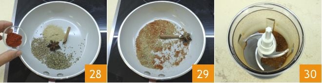 Fügen Sie schließlich das Chilipulver hinzu 28 und rösten Sie alles bei starker Hitze etwa 2 Minuten, gerade so lange, bis die Gewürze ihre Aromen freisetzen 29. Lassen Sie danach die Gewürzmischung abkühlen und geben Sie sie in einen Mixer, schalten Sie ihn für einige Sekunden ein 30 und stellen Sie die Mischung beiseite.