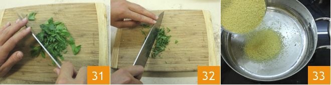Bereiten Sie nun die Mischung aus frischen Gewürzen vor: Spülen Sie die frische Petersilie unter fließendem Wasser ab und hacken Sie sie fein 31, machen Sie dasselbe mit den Minzblättern, waschen und hacken Sie sie 32. Dann buttern Sie einen großen Topf mit hohem Rand und geben den vorgekochten Couscous hinein 33, verteilen Sie ihn so, dass er sich nicht zu sehr überlappt.