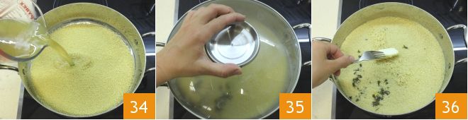 Geben Sie nach und nach etwa 300 ml Brühe hinzu 34, rühren Sie mit einer Gabel um. Decken Sie die Mischung ab und lassen Sie sie 10 Minuten ruhen, bis sie aufquillt 35. Nach dieser Zeit fügen Sie 20 g Butter hinzu und lockern den Couscous mit den Zinken einer Gabel auf 36.