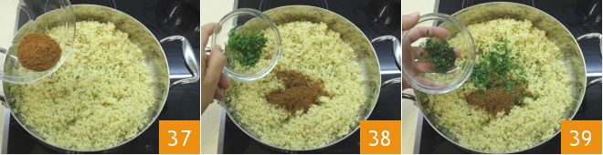 Geben Sie die gemahlene Gewürzmischung hinzu 37, die gehackte Petersilie und Minze (38-39).