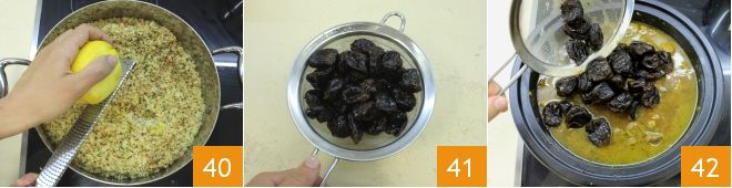 Reiben Sie die Schale einer Zitrone ab 40 und rühren alles gut um, um es zu vermischen. Lassen Sie den Couscous abgedeckt ruhen, bis die Tajine servierfertig ist. Zum Schluss lassen Sie die Pflaumen durch ein Sieb vom Orangensaft abtropfen 41 und geben Sie sie zum Lamm 42.