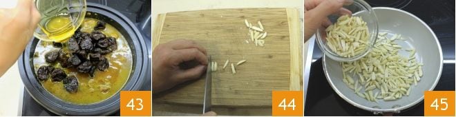 Fügen Sie den Millefiori-Honig hinzu 43, der die süß-saure Note verstärkt, und lassen Sie alles weitere 20 Minuten kochen. Alternativ können Sie den Honig durch Rohrzucker ersetzen. In der Zwischenzeit legen Sie die geschälten ganzen Mandeln auf ein Schneidebrett und schneiden sie in Streifen 44, dann geben Sie die Mandelstreifen in eine beschichtete Pfanne 45 und rösten sie bei mittlerer Hitze, bis sie goldbraun sind, und achten Sie darauf, sie nicht zu verbrennen.