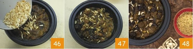 Fügen Sie nun die Mandeln zur Lamm-Pflaumen-Gewürzmischung hinzu 46 und rühren Sie um, um alles zu vermengen 47. Jetzt müssen Sie nur noch die Lamm-Tajine mit Pflaumen und Mandeln sofort servieren, begleitet von dem aromatischen Couscous 48!