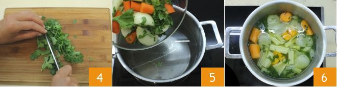 Spülen Sie ein Bündel frischen Koriander unter fließendem Wasser ab, legen Sie es auf ein Schneidebrett und hacken Sie es 4, alternativ können Sie auch getrockneten Koriander verwenden. Geben Sie nun das gehackte Gemüse und den frischen Koriander in das kochende Wasser 5 und lassen Sie es bei niedriger Hitze mindestens 20-30 Minuten köcheln 6. Lassen Sie die Brühe leicht köcheln, damit das Gemüse langsam gart und seinen Geschmack abgibt.