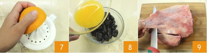 In der Zwischenzeit pressen Sie die Orangen aus 7 und gießen den gewonnenen Saft über die Pflaumen für die Lamm-Tajine 8. Lassen Sie die Pflaumen etwa 1 Stunde marinieren, damit sie sich rehydrieren. Der Orangensaft verleiht den Pflaumen eine angenehme säuerliche Note, aber Sie können auch Apfel- oder Beerenfruchtsaft verwenden, wichtig ist, dass er ohne Fruchtfleisch ist und gut zum Geschmack der Pflaumen passt. Jetzt widmen Sie sich dem Schneiden des Lammfleischs: Legen Sie die Lammkeule auf ein Schneidebrett und entfernen Sie die Fettteile mit einem scharfen Messer 9.