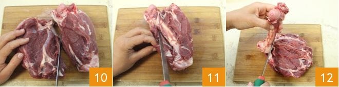 Teilen Sie dann die Keule in zwei Hälften 10 und schneiden Sie das Fleisch mit dem Messer um den Knochen herum 11, bis Sie ihn vollständig herausziehen können 12.
