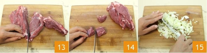 Teilen Sie das Lammfleisch 13 und schneiden Sie es in regelmäßige Würfel von etwa 2 cm 14, damit das Garen gleichmäßiger wird. Schälen Sie dann eine Zwiebel und hacken Sie sie zusammen mit den beiden geschälten Knoblauchzehen 15.