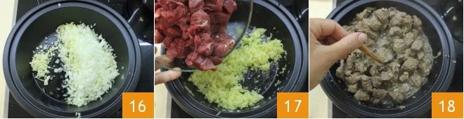 Nehmen Sie die Tajine, den typischen Tontopf Nordafrikas, stellen Sie ihn auf das Feuer, geben Sie etwas Öl hinein und lassen Sie die gehackte Zwiebel und den Knoblauch goldbraun werden 16. Nach 2 Minuten fügen Sie die Lammfleischwürfel hinzu 17 und braten sie unter Rühren mit einem Löffel an. Geben Sie eine Zimtstange hinzu 18.