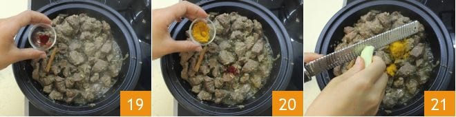 Fügen Sie auch den Safran 19, die Kurkuma 20 hinzu und reiben Sie schließlich den frischen Ingwer hinein 21. Gut umrühren und alles 5 Minuten bei geschlossenem Tajine-Deckel anbraten lassen.