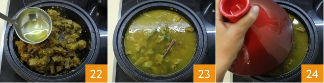 Nach dieser Zeit salzen und pfeffern Sie nach Geschmack und geben zwei Kellen Brühe hinzu 22, die inzwischen fertig sein sollte, bis das gewürzte Fleisch vollständig bedeckt ist 23. Decken Sie die Tajine mit ihrem zylindrischen Deckel 24 ab und lassen Sie sie etwa eine Stunde bei sehr niedriger Hitze köcheln.