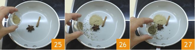 In der Zwischenzeit widmen Sie sich dem Couscous: Beginnen Sie damit, die Mischung aus getrockneten Gewürzen zu rösten. Geben Sie in eine beschichtete Pfanne den Sternanis und eine Zimtstange, fügen Sie das gemahlene Kardamom 25, Fenchelsamen 26 und Kreuzkümmel 27 hinzu.