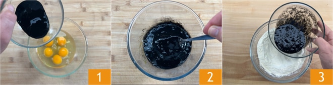 Um die Tagliatelle mit Sepia-Tinte, Pecorino, Miesmuscheln und Lardo zuzubereiten, beginnen Sie mit der frischen Pasta: Schlagen Sie die Eier in eine Schüssel und geben Sie die Sepia-Tinte hinzu 1, dann verquirlen Sie sie mit einer Gabel, um sie zu vermischen 2. Gießen Sie diese Mischung in eine Schüssel, in der Sie das 00-Mehl und den Hartweizengrieß gemischt haben 3.